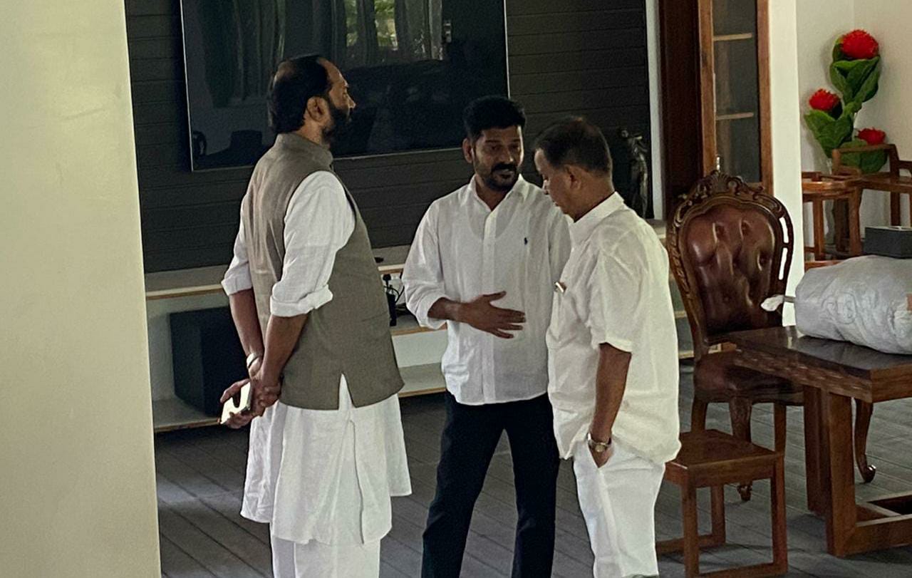 బిక్షపతి యాదవ్ తో చర్చిస్తున్న టిపిసిసి అధ్యక్షుడు ఉత్తమ్ కుమార్, పార్టీ వర్కింగ్ ప్రెసిడెంట్ రేవంత్ రెడ్డి.