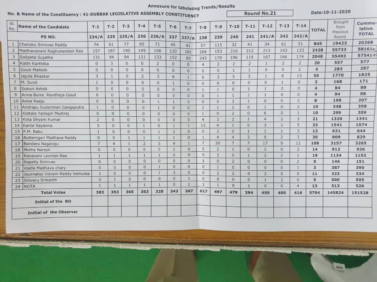 దుబ్బాక ఫలితాలు : 21 వ రౌండ్ ముగిసే సరికి 620 ఓట్ల ఆధిక్యతతో బిజెపి