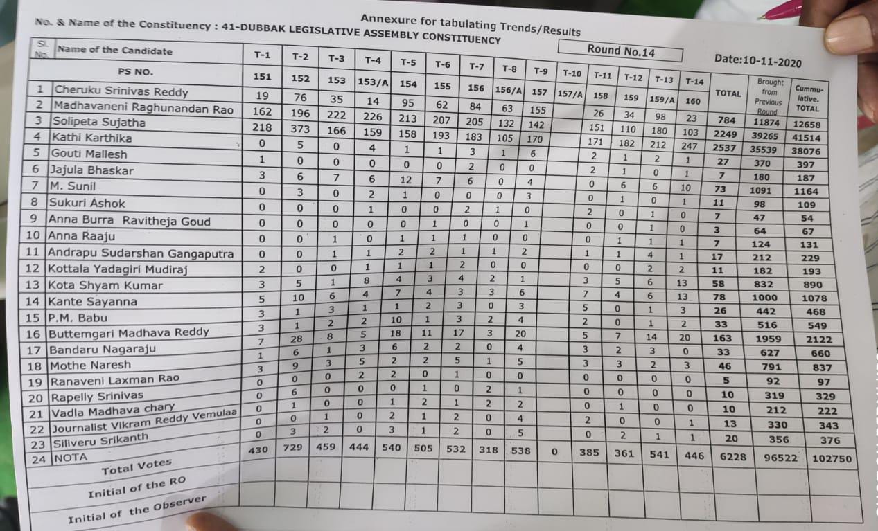 దుబ్బాక ఫలితాలు: 14 వ రౌండ్ లో టిఆర్ఎస్ కు 288 ఆధిక్యం