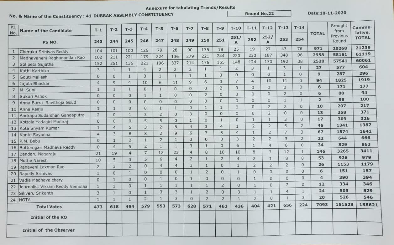 వార్తలుస్పాట్ న్యూస్ దుబ్బాక ఫలితాలు : 22 వ రౌండ్ ముగిసే సరికి 1058 ఓట్ల ఆధిక్యతతో బిజెపి By నమస్తే ప్రతినిధి - November 10, 2020 FacebookTwitterPinterestWhatsApp దుబ్బాక ఉప ఎన్నిక ఫలితాలు… 22వ రౌండ్ పలితాలు: బీజేపీ : 2958 టీఆర్ఎస్ : 2520 కాంగ్రెస్ : 971 బీజేపీ ఆధిక్యత : 438 మొత్తంగా ఓట్ల లెక్క చూస్తే బిజెపి : 61119 టీఆర్ఎస్ : 60061 కాంగ్రెస్ : 21239 బీజేపీ లీడ్: 1058 Advertisement