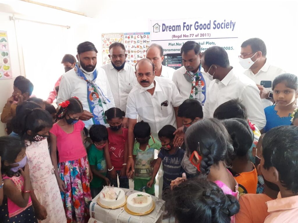 డ్రీమ్ ఫ‌ర్ గుడ్ సొసైటీలో చిన్నారుల‌తో క‌లిసి కేక్ ను క‌ట్ చేస్తున్న క‌రుణాక‌ర్ రెడ్డి, న‌రాల మ‌హేశ్వ‌ర్ రెడ్డి