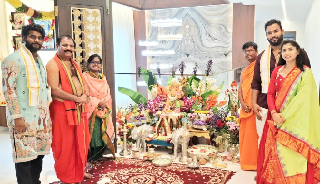 శేరిలింగంపల్లి, ఆగస్టు 27 (నమస్తే శేరిలింగంపల్లి): శేరిలింగంపల్లి నల్లగండ్లలోని వర్టెక్స్ విల్లాస్ స్వగృహంలో శేరిలింగంపల్లి కార్పొరేటర్ రాగం నాగేందర్ యాదవ్, మాజీ స్టేట్ సోషల్ వెల్ఫేర్ బోర్డు చైర్ పర్సన్ రాగం సుజాత యాదవ్ కుటుంబ సమేతంగా వినాయక చవితి పండుగను పురస్కరించుకుని వేద పండితులచే విఘ్నేశ్వరుడికి ప్రత్యేక పూజలు నిర్వహించారు. ఈ సందర్భంగా వారు మాట్లాడుతూ శేరిలింగంపల్లి నియోజకవర్గం, డివిజన్ ప్రజలకు వినాయక చవితి శుభాకాంక్షలు తెలిపారు. ప్రజలు సుఖంగా ఉండాలని, రైతుల పంటలు సమృద్ధిగా పండాలని వినాయకుడిని కోరుకున్నట్లు చెప్పారు. ప్రతి ఒక్కరూ దేవుడి పట్ల విశ్వాసం కలిగి తోటి వారికి తమవంతు సహకారం అందించాలని కోరారు.