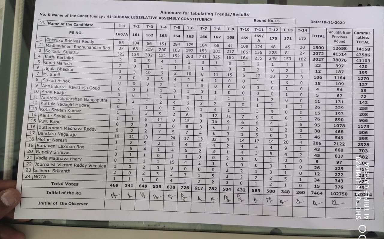 వార్తలుస్పాట్ న్యూస్ దుబ్బాక ఫలితం: 15 వ రౌండ్ లో టిఆర్ఎస్ 955 ఓట్ల ఆధిక్యం By EDITOR - November 10, 2020 FacebookTwitterPinterestWhatsApp దుబ్బాక ఉప ఎన్నిక ఫలితాలు… 15వ రౌండ్ పలితాలు: బీజేపీ : 2072 టీఆర్ఎస్ : 3027 కాంగ్రెస్ : 1500 టిఆర్ఎస్ ఆధిక్యత : 955 మొత్తంగా ఓట్ల లెక్క చూస్తే బిజెపి : 43586 టీఆర్ఎస్ : 41103 కాంగ్రెస్ : 14158 బిజెపి లీడ్: 2483 15 వ రౌండ్ ఫలితాలు పూర్తి వివరాలు Advertisement
