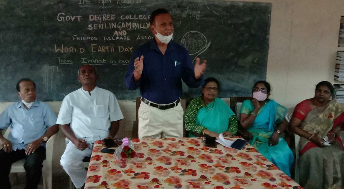 మానవుల బాధ్యతారాహిత్యం వల్ల పెరుగుతున్న కాలుష్యంతో భూమి మనుగడకే ప్రమాదం వాటిల్లే పరిస్థితి ఏర్పడిందన్నారు. ఆదివాసీలు, అడవులలో బ్రతికే వారు తమ చుట్టూ ఉన్న ప్రకృతితో జీవనం చేస్తుంటే అన్ని తెలిసిన నాగరికుడు అభివృద్ధి, ప్రగతి పేరుతో పరిశ్రమలు స్థాపించి, హద్దు, అదుపు లేకుండా ప్రకృతి వనరులను దోచేస్తున్నారన్నారు. భూతాపం విపరీతంగా పెరిగి పర్యావరణంలో అనేక మార్పులు చోటుచేసుకొని తత్ఫలితంగా ప్రకృతి వైపరీత్యాలు సంభవించే ప్రమాదం ఉందని చెప్పారు. మనిషి సాధించిన అభివృద్ధి ఏమిటీ అని కరోనా ప్రశ్నిస్తూ మనిషి తెలివితో సాధించిన అభివృద్ధి తనని నాశనం చేయడం లేదని ఎగతాళిగా నవ్వుతూ, ఖాళీగా ఉండే స్మశానాలను రద్దిగా మార్చిందన్నారు. చంద్రుడితో పాటు ఇతర గ్రహాల పైకి వెళ్లి జీవనం సాగించటానికి వీలుందని తెలుసుకొనేంత జ్ఞానం ఉన్న మనిషి కంటికి కనిపించని చిన్న వైరస్ ను నాశనం చేయలేకపోవటం అనేది ఇన్ని సంవత్సరాలుగా సాధించిన అభివృద్ధిని వేలెత్తి చూపిస్తుందన్నారు. ఈ మహమ్మారి సృష్టిస్తున్న అల్లకొల్లోలం గుర్తించి పుడమి తల్లితో పాటు, పంచభూతులను రక్షించుకుని మానవ మనుగడను ప్రశాంతంగా కొనసాగించేందుకు జీవన శైలిలో మార్పులు చేసుకోవాల్సిన అవసరం ఉందన్నారు. మిగతా దేశాల కంటే భారతీయులకు భూమితో ఉన్న అనుబంధం చాలా ఎక్కువ అని, మన సంస్కృతి మనకు నేర్పింది పర్యావరణ పరిరక్షణే అని, మన భూగోళాన్ని కాపాడుకోవటం కోసం కొన్ని చర్యలు చేపట్టాల్సి ఉంటుందన్నారు. వాహనాల వాడకం తగ్గించి, అనవసర విద్యుత్ వాడకం, అడవులను నాశనం చెయ్యకుండా చెట్లను పెంచటం అలవాటుచేసుకుందామని అన్నారు. భూమికి హాని చేసే ప్లాస్టిక్ వాడకాన్ని పూర్తిగా నిషేదించి, ప్రకృతి వనరులను సంరక్షించుకొని, భవిష్యత్ తరాలకు కాలుష్య రహిత సమాజాన్ని అందిద్దామని పిలుపునిచ్చారు. ఈ కార్యక్రమంలో ప్రిన్సిపాల్ డాక్టర్ నిక్కత్ అంజూమ్, వైస్ ప్రిన్సిపాల్ సి.జ్యోతి, ఎకనామిక్స్ లెక్చరర్ పి.మురళి కృష్ణ, అధ్యాపకులు సీహెచ్ బిక్షపతి, డా. అర్ జి వి మోహన్, డా. అనిత, సీహెచ్ జానయ్య, డా. ఎన్ గోపాల్, ఫ్రెండ్స్ వెల్ఫేర్ అసోసియేషన్ సభ్యులు గంగాధర్, శివరామకృష్ణ, పాలెం శ్రీను, జనార్దన్, విష్ణుప్రసాద్ తదితరులు పాల్గొన్నారు.
