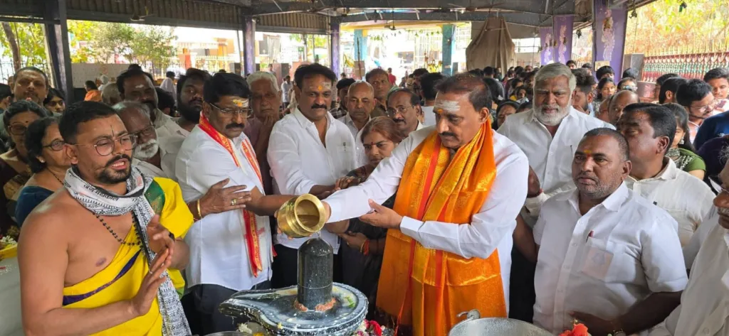 శేరిలింగంపల్లి, ఫిబ్ర‌వ‌రి 15 (న‌మ‌స్తే శేరిలింగంపల్లి): మహా శివరాత్రి పర్వదినం సందర్భంగా హైదర్ నగర్ డివిజన్ పరిధిలోని HMT హిల్స్ కాలనీ లో రామాలయం లోని శివాలయంలో మాజీ కార్పొరేటర్లు నార్నె శ్రీనివాసరావు, ఉప్పలపాటి శ్రీకాంత్ ల‌తో కలిసి PAC చైర్మన్ ఆరెకపూడి గాంధీ ప్రత్యేక పూజలు నిర్వహించి పరమేశ్వరుడికి అభిషేకం చేశారు. ఈ సందర్భంగా PAC చైర్మన్ ఆరెక పూడి గాంధీ మాట్లాడుతూ మహా శివరాత్రి పర్వదినం అతి పవిత్ర దినం అని, శివుడికి అత్యంత ఇష్టమైన రోజు అని అన్నారు. శివరాత్రి నాడు వాడ వాడలా రోజు వారీ ఉపవాస దీక్షలతో , జాగారంతో వేడుక చేసుకుంటార‌ని అన్నారు. ఈ కార్యక్రమంలో నాయకులు, కార్యకర్తలు, భక్తులు తదితరులు పాల్గొన్నారు.