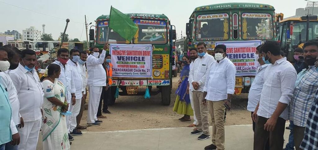 మియాపూర్ న్యూ కాల‌నీలో ప్రత్యేక పారిశుధ్య కార్యక్రమాన్ని జెండా ఊపి ప్రారంభిస్తున్న ప్రభుత్వ విప్ ఆరెకపూడి గాంధీ, డీసీ సుధాంష్