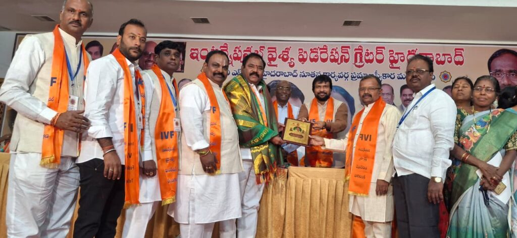 శేరిలింగంపల్లి, డిసెంబర్ 14 (నమస్తే శేరిలింగంపల్లి): శేరిలింగంపల్లి నియోజకవర్గం చందానగర్ డివిజన్ లోని క్రిస్టల్ గార్డెన్స్ ఫంక్షన్ హాల్ లో ఇంటర్నేషనల్ వైశ్య ఫెడరేషన్ గ్రేటర్ హైదరాబాద్ ఆధ్వర్యంలో నిర్వహించిన ఐవీఎఫ్ గ్రేటర్ హైదరాబాద్ నూతన కార్యవర్గ ప్రమాణ స్వీకార మహోత్సవం, శ్రీ వెంకటేశ్వర స్వామి కల్యాణ మహోత్సవ కార్యక్రమానికి శేరిలింగంపల్లి కార్పొరేటర్ రాగం నాగేందర్ యాదవ్ ముఖ్య అతిథిగా హాజరయ్యారు. అనంతరం నూతనంగా కార్యవర్గ బాధ్యతలు చేపట్టిన సభ్యులందరికి శాలువా కప్పి మోమెంటోస్ అందజేసి అభినందనలు తెలిపారు.