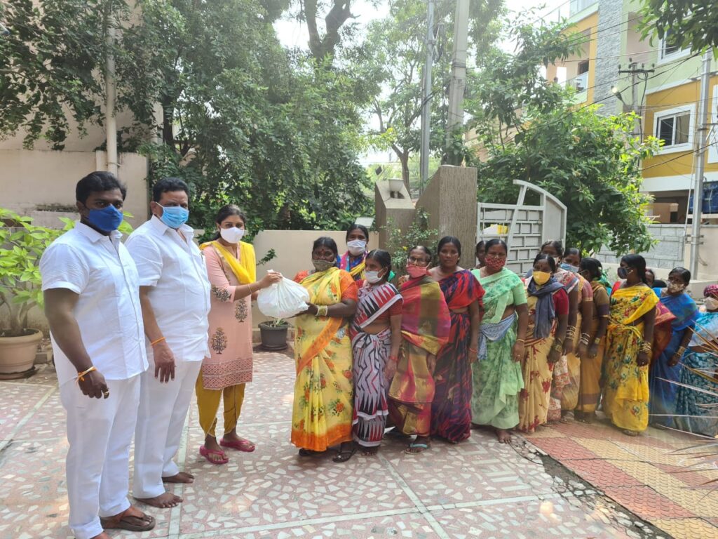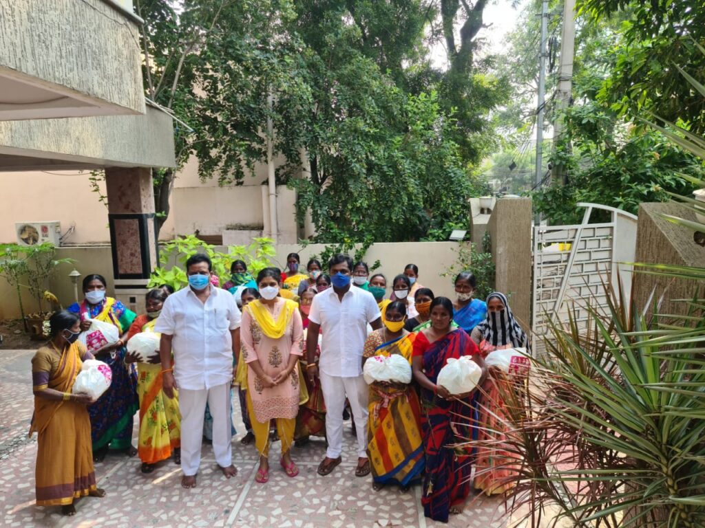 జీహెచ్ఎంసీ పారిశుద్ధ్య కార్మికులకు నిత్యావసర వస్తువులను అంద‌జేస్తున్న మిరియాల చారిటబుల్ ట్రస్ట్ డైరెక్టర్ మిరియాల యామిని దివ్య, మిరియాల రాఘవ రావు, మిరియాల ప్రీతమ్
