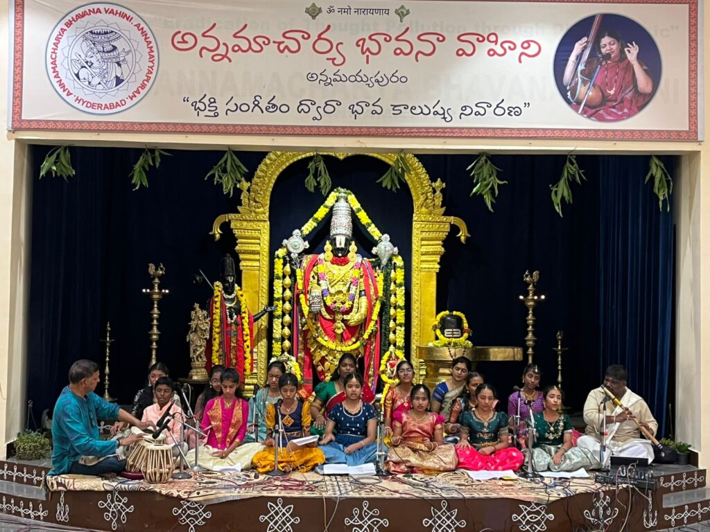 శేరిలింగంపల్లి, ఆగస్టు 23 (నమస్తే శేరిలింగంపల్లి): అన్నమయ్యపురంలో పద్మశ్రీ పురస్కార గ్రహీత డా. శోభా రాజు ఆధ్వర్యంలో కొనసాగుతున్న నిత్య కార్యక్రమాలలో భాగంగా శనివారం మధ్యాహ్న 12 గంటలకు ఆశ్రితులకు అన్నదాన ప్రసాద వితరణ జరగగా, సాయంత్రం 5 గంటల నుండి అన్నమ స్వరార్చన చేశారు. తొలుత విష్ణు సహస్రనామ స్తోత్రము, లక్ష్మీ అష్టోత్తర శతనామ స్తోత్రం, అన్నమయ్య అష్టోత్తరం, గురు స్తుతి నిర్వహించారు. తదుపరి మోహన మురళి మ్యూజిక్ అండ్ డాన్స్ అకాడమీ బృందం బృంద రవి కిరణ్, శ్రీనిధి మంతెన, ఎల్. అక్షర, ఎం. అక్షర, సంహిత, మోహిత్, గీత, చైత్ర, హారిక, హంసిక, ప్రహర్షి, అద్రిత, మనస్విని, వినమ్ర, హర్షిని సంయుక్తంగా మహా గణేశ పంచరత్నం, శ్రీమన్నారాయణ, ఇందరికి అభయమ్ములిచ్చు చేయి, బ్రహ్మ కడిగిన పాదము, మాధవ కేశవ, ఆది మూలమే, చక్కని తల్లికి, రామచంద్రుడితడు, మనుజుడై పుట్టి, గోవింద గోవింద, శరణు శరణు, అదివో అల్లదివో, నారాయణతే నమో నమో, బ్రహ్మమొక్కటే అనే చక్కని కీర్తనలకు తమ మధుర స్వరాలను జోడించి శ్రీ స్వరసిధ్ధి వేంకటేశ్వర స్వామి వారికి సభక్తి పూర్వకంగా అన్నమ స్వరార్చనను అందించారు. వీరికి ఉమాశంకర్ మంతెన ఫ్లూట్ (వేణువు) తో, గుణరాజన్ తబలాతో వాయిద్య సహకారం అందించారు. అనంతరం కళాకారులకు సంస్థ మేనేజింగ్ ట్రస్టీ డా. నందకుమార్, సంస్థ వ్యవస్థాపకురాలు డా. శోభా రాజు జ్ఞాపికలను అందించారు. చివరిగా శ్రీ స్వర సిద్ధి వేంకటేశ్వర స్వామి వారికి మంగళ హారతులు అందించి వచ్చిన భక్తులందరికీ ప్రసాద వితరణ చేశారు.