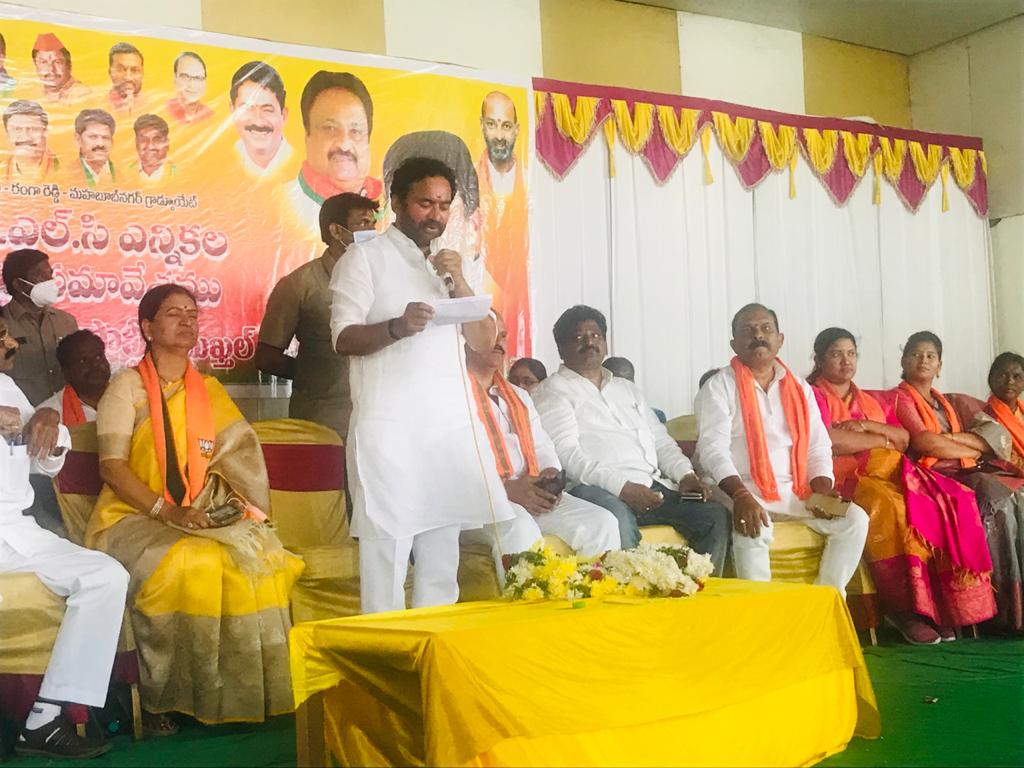 స‌మావేశంలో మాట్లాడుతున్న కేంద్ర హోంశాఖ స‌హాయ మంత్రి కిష‌న్‌రెడ్డి, వెధిక‌పై డీకే అరుణ‌, నంద‌కుమార్ యాద‌వ్ త‌దిత‌రులు