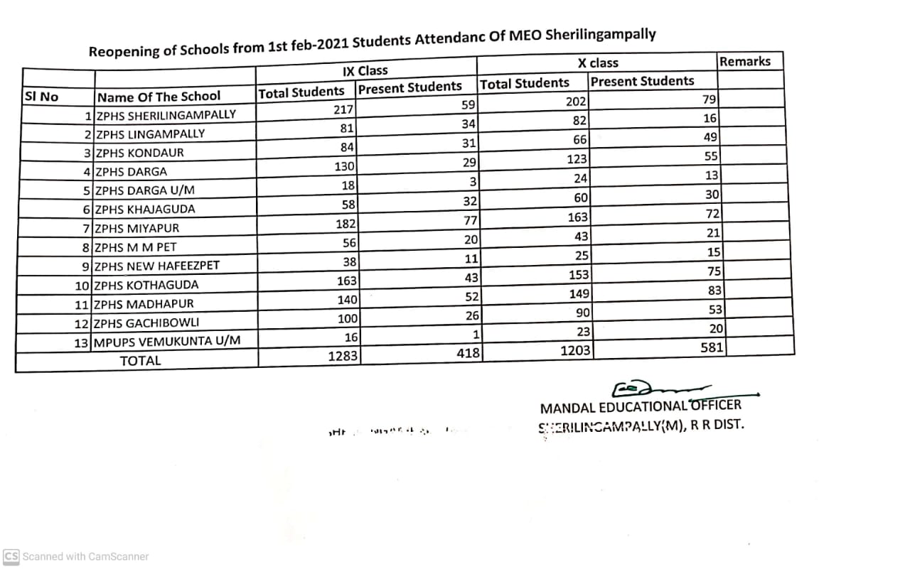 శేరిలింగంపల్లి మండల పరిధిలోని 13 ప్రభుత్వ పాఠశాలల్లో తొలి రోజు 40 శాతం విద్యార్థులు హాజరయ్యారు. మండల వ్యాప్తంగా 9, 10వ తరగతి చదివి విద్యార్థులు 2486 మంది ఉండగా 999 మంది విద్యార్థులు హాజరయ్యారు. శేరిలింగంపల్లి ప్రభుత్వ ఉన్నత పాఠశాలలో 9, 10వ తరగతుల్లో కలిపి 419 మంది విద్యార్థులకు గానూ 138 మంది, లింగంపల్లి పాఠశాలలో 163 మంది విద్యార్థులకు గానూ 50 మంది, కొండాపూర్ పాఠశాలలో 150 మంది విద్యార్థులకు గానూ 80 మంది, దర్గా పాఠశాలలో 253 మందికి గానూ 84 మంది, దర్గా ఉర్దూ మీడియం పాఠశాలలో 42 మందికి గానూ 16 గురు, ఖాజాగూడ పాఠశాలలో 118 మందికి గానూ 62 మంది, మియాపూర్ పాఠశాలలో 345 మందికి గానూ 149, మక్తా మహబూబ్పేట్ పాఠశాలలో 99 మందికి గానూ 41 మంది, న్యూ హఫీజ్పేట్ పాఠశాలలో 63 మందికి గానూ 26గురు, కొత్తగూడ పాఠశాలలో 316 మందికి గానూ 118 మంది, మాదాపూర్ పాఠశాలలో 289 మందికి గానూ 135 మంది, గచ్చిబౌలి పాఠశాలలో 190 మందికి గానూ 79 మంది, వేముకుంట ఉర్దూ మీడియం పాఠశాలలో 39 మందికి గానూ 21 మంది విద్యార్థులు హాజరైనట్లు ఎంఈఓ వెంకటయ్య తెలిపారు.