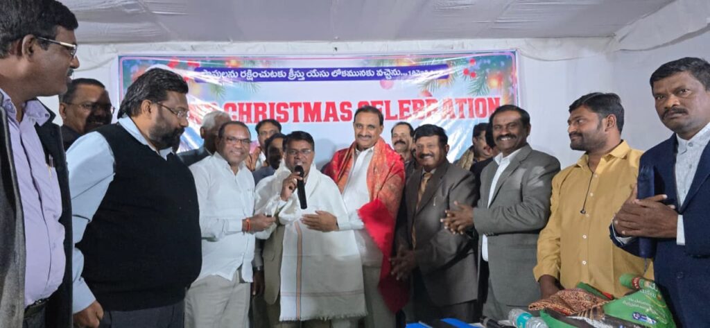 శేరిలింగంపల్లి, డిసెంబర్ 22 (నమస్తే శేరిలింగంపల్లి): శేరిలింగంపల్లి డివిజన్ పరిధిలోని మసీదు బండ CMC కాలనీలో బెరయా ప్రార్థన మందిరంలో పాస్టర్ జర్మయ్య ఆధ్వర్యంలో నిర్వహించిన సెమీక్రిస్మస్ వేడుకలలో కార్పొరేటర్లు నార్నె శ్రీనివాసరావు, ఉప్పలపాటి శ్రీకాంత్, పాస్టర్ల తో కలిసి PAC చైర్మన్ ఆరెకపూడి గాంధీ క్రిస్మస్ కేక్ ను కట్ చేసి క్రిస్మస్ పండుగ శుభాకాంక్షలు తెలియజేశారు. ఈ సందర్బంగా PAC చైర్మన్ గాంధీ మాట్లాడుతూ క్రిస్మస్ పండుగను ఘనంగా నిర్వహించుకోవడానికి చర్చిల వద్ద అన్ని రకాల వసతులు కల్పించాలని , అన్ని ఏర్పాట్లు చేయాలని అధికారులను ఆదేశించారు. ఎటువంటి ఇబ్బంది కలగకుండా చక్కటి వాతావరణంలో పండుగ నిర్వహించుకునేలా అన్ని రకాల ఏర్పాట్లను చేయాలని అన్నారు. ఈ కార్యక్రమంలో నాయకులు అనిల్ యాదవ్, చాంద్ పాషా, కార్తిక్, పాస్టర్లు, క్రైస్తవులు తదితరులు పాల్గొన్నారు.