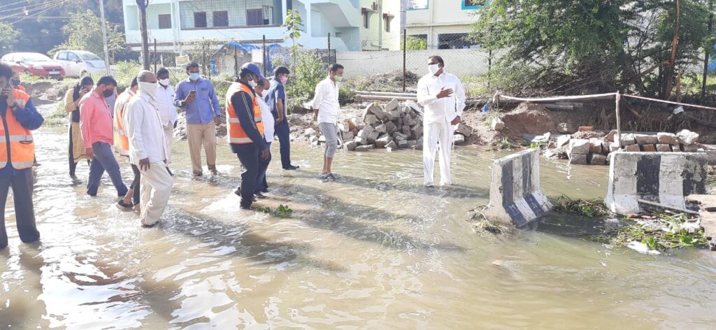 చందానగర్ (నమస్తే శేరిలింగంపల్లి): భారీ వర్షాల నేపథ్యంలో చందానగర్ డివిజన్ పరిధిలో ముంపుకు గురైన దీప్తి శ్రీ నగర్ లో జోనల్ కమీషనర్ రవి కిరణ్, కార్పొరేటర్ బొబ్బ నవత రెడ్డి, GHMC అధికారులతో కలిసి ప్రభుత్వ విప్ ఆరెకపూడి గాంధీ పర్యటించారు. ఈ సందర్భం ఆరెకపూడి గాంధీ మాట్లాడుతూ.. శేరిలింగంపల్లి నియోజకవర్గంలో ముంపు ప్రాంతాల్లో ఎక్కడ సమస్య ఉన్నా తక్షణమే అధికారులతో కలిసి వెళ్లి సమస్య పరిష్కారానికి కృషి చేయడం జరుగుతుందని తెలియజేశారు. నాలా విస్తరణ పనులలో భాగంగా మిగిలిపోయిన అసంపూర్తి పనులను వెంటనే చేపట్టాలని, త్వరితగతిన పూర్తి చేసి ప్రజలకు అందుబాటులోకి తీసుకురావాలని, ప్రజలకు ఎటువంటి ఇబ్బంది కలగకుండా చూడాలని అన్నారు.