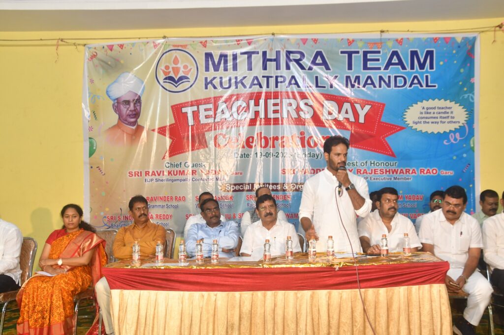 శేరిలింగంపల్లి, సెప్టెంబర్ 19 (నమస్తే శేరిలింగంపల్లి): శేరిలింగంపల్లి నియోజకవర్గం పరిధిలోని కూకట్ పల్లి వివేకానంద నగర్ డివిజన్ VNR బాంకెట్ హాల్ అయ్యప్ప స్వామి ఆలయ ప్రాంగణంలో మిత్ర టీం కూకట్ పల్లి మండల్ ఆధ్వర్యంలో టీచర్స్ డే వేడుకలను ఘనంగా నిర్వహించారు. ఈ కార్యక్రమంలో వడ్డేపల్లి రాజేశ్వరరావు , సురభి రవీందర్ రావు, జిల్లా ఉపాధ్యక్షురాలు స్రవంతిలతో కలిసి బీజేపీ రాష్ట్ర కార్యవర్గ సభ్యుడు, కాంటెస్టెడ్ ఎమ్మెల్యే, నియోజకవర్గ ఇన్చార్జి రవి కుమార్ యాదవ్ పాల్గొన్నారు. ఈ సందర్భంగా కూకట్పల్లి పరిసర ప్రాంతాల ప్రయివేట్ పాఠశాలల కరస్పాండెంట్స్, టీచర్స్ ను రవి కుమార్ యాదవ్ సన్మానించారు. అనంతరం ఆయన మాట్లాడుతూ క్రమశిక్షణను, ఆత్మవిశ్వాసాన్ని ఉపాధ్యాయులు నేర్పిస్తారని, తల్లిదండ్రులను, విద్య నేర్పిన గురువులను జీవితంలో ఎప్పటికీ మర్చిపోకూడదని అన్నారు. విద్య నేర్పే గురువులు లేకపోతే మన జీవితం శూన్యమని, వారు నేర్పిన చదువు వల్లనే ఈరోజు మనమంతా ఈ స్థాయిలో ఉన్నామని అన్నారు. ఈ కార్యక్రమంలో మిత్ర మండలి సభ్యులు రవీందర్ రావు, అశోక్ , నరేందర్, మల్లేష్ , శ్రీశైలం, ఇంద్రసేనారెడ్డి, నాగరాజు, రమణ, వెంకటస్వామి, విష్ణువర్ధన్ రెడ్డి, శ్రీనివాసులు తదితరులు పాల్గొన్నారు.