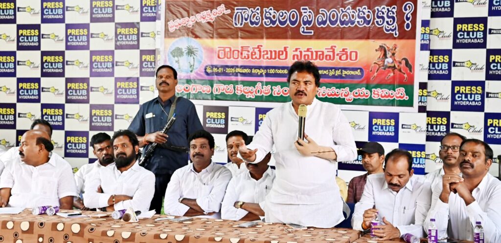 శేరిలింగంపల్లి, జనవరి 5 (నమస్తే శేరిలింగంపల్లి): రాష్ట్ర ప్రభుత్వం కల్లుగీత వృత్తిని నిర్బంధించిందని, కల్లుగీత సొసైటీల ప్రతినిధులపై కేసులు బనాయిస్తూ దాడులు చేస్తున్నదని తెలంగాణ గౌడ కల్లు గీత సంఘాల సమన్వయ కమిటీ ఆందోళన వ్యక్తం చేసింది. ఒకవైపు ప్రభుత్వ సహకారం లేక, మరోవైపు తమ వృత్తికి రక్షణ లేక కల్లుగీతవృత్తిదారుల జీవనం ఆగమ్యగోచరంగా మారిందని పేరొన్ననది. కాంగ్రెస్ ప్రభుత్వం ఇచ్చిన హామీ మేరకు గీతకార్మికులు ప్రమాదవశాత్తూ మరణిస్తే వారి కుటుంబాలకు రూ.10లక్షల ఎక్స్గ్రేషియా అందజేతకు జీవో తేవాలని, జనగామ జిల్లాకు సర్వాయి పాపన్నగా నామకరణం చేయాలని రాష్ట్ర ప్రభుత్వాన్ని డిమాండ్ చేసింది. వైన్ షాపుల కేటాయింపుల్లో రిజర్వేషన్ల జీవో తీసుకురావాలని, కోహెడలోని గౌడ ఆత్మగౌరవ భవనం పనులు ప్రారంభించాలని కోరింది. ఈ మేరకు సోమవారం హైదరాబాద్ సోమాజిగూడ ప్రెస్ క్లబ్లో తెలంగాణ గౌడ కల్లుగీత సంఘాల సమన్వయ కమిటీ ఆధ్వర్యంలో యెలికట్టె విజయ్ కుమార్ గౌడ్ అధ్యక్షతన రౌండ్ టేబుల్ సమావేశం జరిగింది.