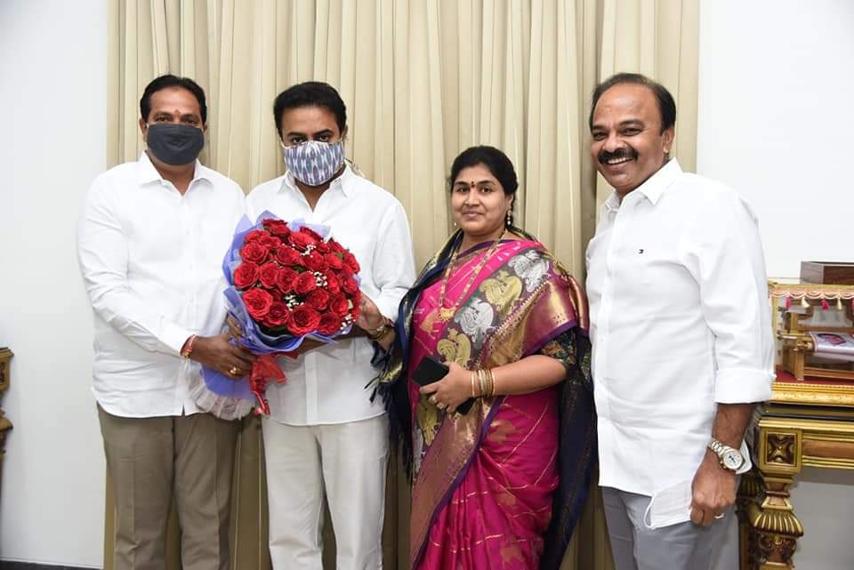 మాదాపూర్ (నమస్తే శేరిలింగంపల్లి): తెలంగాణ రాష్ట్ర మున్సిపల్ శాఖ మంత్రి, టిఆర్ఎస్ వర్కింగ్ ప్రెసిడెంట్ కేటీఆర్ ని, చేవెళ్ల పార్లమెంట్ సభ్యుడు డాక్టర్ జి.రంజిత్ రెడ్డిని బుధవారం హఫీజ్పేట, మాదాపూర్ డివిజన్ల కార్పొరేటర్లు పూజిత, జగదీశ్వర్ గౌడ్లు మర్యాదపూర్వకంగా కలిశారు. ఇటీవల జరిగిన జీహెచ్ఎంసీ ఎన్నికలలో రెండో సారి ఇరువురూ కార్పొరేటర్లుగా విజయం సాధించిన సందర్భంగా వారు ప్రగతి భవన్లో మంత్రి కేటీఆర్, ఎంపీ రంజిత్ రెడ్డిలను కలిశారు. అనంతరం మంత్రి, ఎంపీలకు కార్పొరేటర్లు పుష్పగుచ్ఛం అందజేసి ధన్యవాదాలు తెలిపారు. తమకు మళ్లీ కార్పొరేటర్లుగా పోటీ చేసేందుకు అవకాశం ఇచ్చినందుకు కృతజ్ఞతలు తెలిపారు. ప్రజలు తమపై ఉంచి నమ్మకాన్ని వమ్ము చేయకుండా పనిచేస్తామని తెలిపారు. అనంతరం మంత్రి, ఎంపీలు కార్పొరేటర్లకు శుభాకాంక్షలు తెలిపారు.