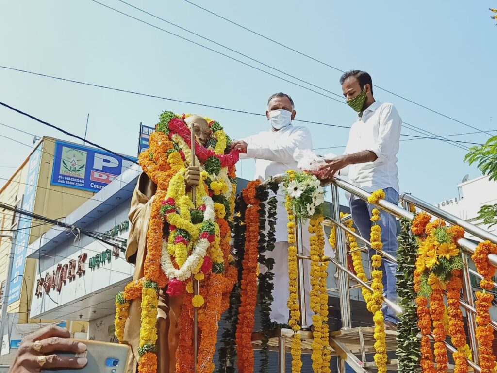 కొండాపూర్ (నమస్తే శేరిలింగంపల్లి): ప్రపంచానికి శాంతి నినాదాన్ని అందించిన మహోన్నతుడు మన జాతిపిత మహాత్మా గాంధీ అని, ఆయన స్ఫూర్తితో యువత ముందుకు సాగాలని కొండాపూర్ కార్పొరేటర్ హమీద్ పటేల్ పిలుపునిచ్చారు . మహాత్మా గాంధీ 151 వ జయంతిని పురస్కరించుకొని కొండాపూర్ కార్పొరేటర్ హమీద్ పటేల్ చందానగర్ చౌరస్తాలోని మహాత్మా గాంధీ విగ్రహానికి పూలమాలలను వేసి అంజలి ఘటించారు. అనంతరం శ్రీరామ్ నగర్ చౌరస్తా లో గాంధీ పటానికి పూలమాల వేసి అంజలి ఘటించారు.