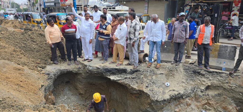 శేరిలింగంపల్లి, సెప్టెంబర్ 20 (నమస్తే శేరిలింగంపల్లి): ఆల్విన్ కాలనీ డివిజన్ పరిధిలోని గోవింద్ హోటల్ చౌరస్తాలో అండర్ గ్రౌండ్ డ్రైనేజి(UGD) పైప్ లైన్ అకస్మాత్తుగా పగిలిపోవడం వలన వెంటనే చేపట్టిన పైప్ లైన్ పునరుద్ధరణ పనులను, జలమండలి అధికారులు, కార్పొరేటర్ దొడ్ల వెంకటేష్ గౌడ్ తో కలిసి PAC చైర్మన్ ఆరెకపూడి గాంధీ పరిశీలించారు. ఈ సందర్బంగా PAC చైర్మన్ గాంధీ మాట్లాడుతూ అండర్ గ్రౌండ్ డ్రైనేజి(UGD) పగిలిపోయిన విషయం తెలియగానే సంఘటన స్థలాన్ని పరిశీలించడం జరిగిందని, చాలా సంవత్సరాల క్రితం వేసిన పాత పైపులు అవడం వలన , వాటి జీవిత కాలం తగ్గడం వలన, అకస్మాత్తుగా పగిలిపోవడం జరుగుతుందని, ఇటువంటి సమస్యలు మళ్ళీ పునరావృతం కాకుండా అన్నిరకాల చర్యలు తీసుకుంటామని తెలిపారు. ఈ సమస్య శాశ్వత పరిష్కారం దిశగా చర్యలు చేపడుతామని అన్నారు. ఈ కార్యక్రమంలో జలమండలి అధికారులు GM హరి కృష్ణ, DGM నాగప్రియ, మేనేజర్ ప్రియాంక GHMC AE శ్రావణి, నాయకులు MD ఇబ్రహీం, శివరాజ్ గౌడ్, పోశెట్టిగౌడ్, గోపాల్, లింగం, సుధాకర్, సత్తయ్య, రాజిరెడ్డి, బ్రహ్మయ్య తదితరులు పాల్గొన్నారు.