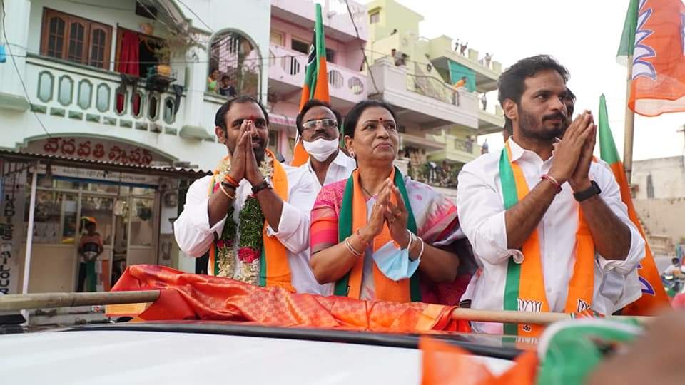 రోడ్ షో లో డివిజన్ ప్రజలకు అభివాదం చేస్తున్న డీకే.అరుణ, రవికుమార్ యాదవ్ లు